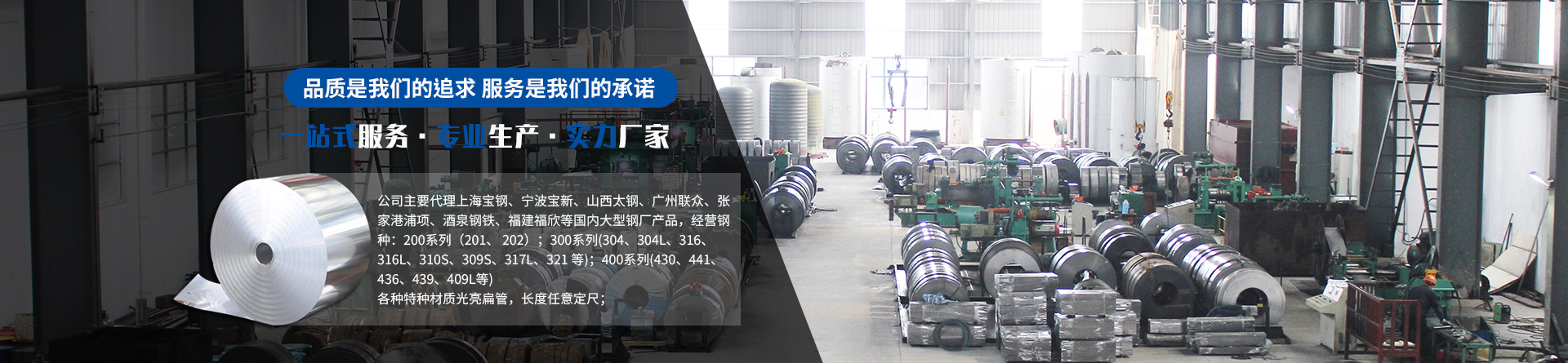 公司主要代理上海寶鋼、寧波寶新、山西太鋼、廣州聯(lián)眾、張家港浦項(xiàng)、酒泉鋼鐵、福建福欣等國(guó)內(nèi)大型鋼廠產(chǎn)品,經(jīng)營(yíng)鋼種:200系列(201、 202);300系列(304、304L、316、316L、310S、309S、317L、321 等);400系列(430、441、436、439、409L等)。